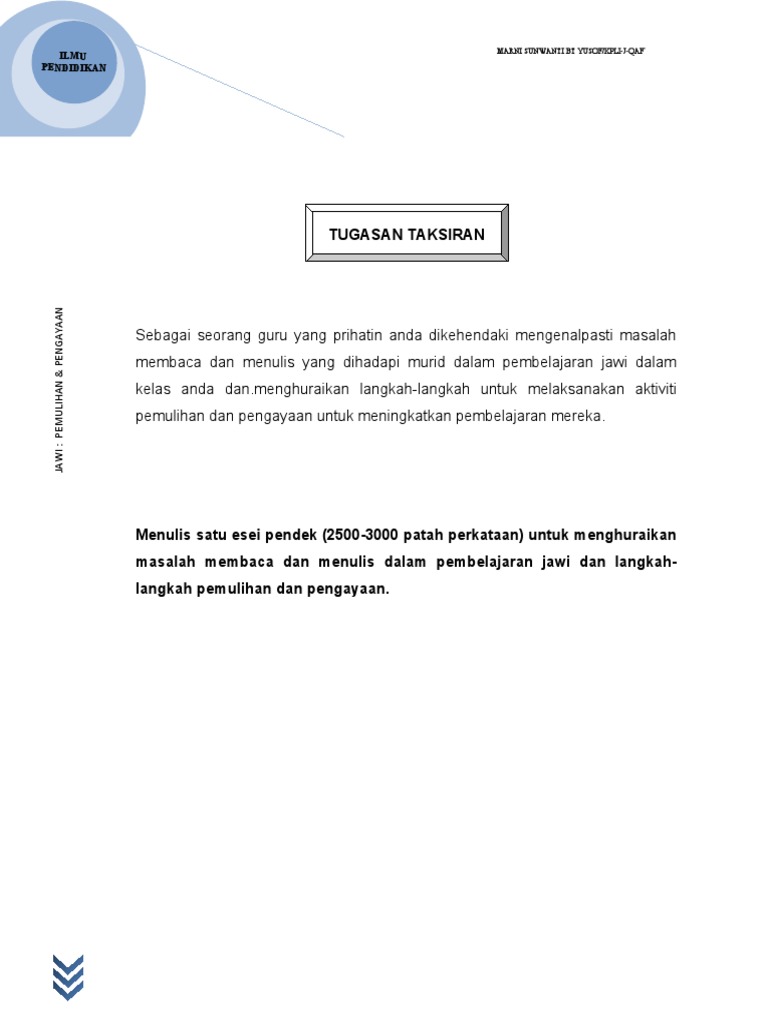 Khusus tentang literasi kemahiran menulis diperlukan bagi melengkapkan kajian literasi sebelumnya yang lebih tertumpu pada kemahiran membaca serta dapat dibuat bandingan dengan tahap penguasaan kemahiran menulis yang telah dijalankan di luar Negara Purve 1992. Kepada kemahiran membaca dan menulis Jawi dan tulisan ini hanya diajar dalam subjek pendidikan Islam dan bukannya subjek bahasa Melayu10 Selain itu pada tahun 2004 kerajaan telah memperkenalkan program J-Qaf di sekolah rendah bagi meningkatkan penguasaan tulisan Jawi fardhu ain dan al-Quran. Murni Binti Hashim SK Raja Chulan Desa Cempaka Ipoh.