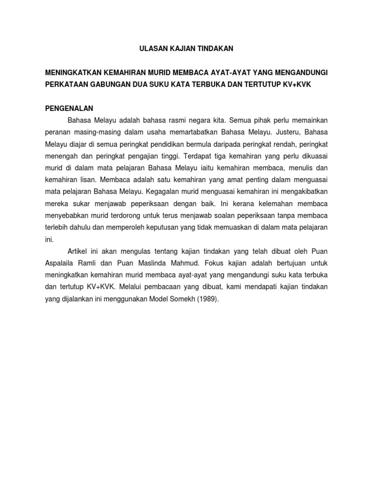 View Kajian-Tindakan-Pelajaran-Jawidocx from A 1233 at Mrsm. Sebanyak tiga instrumen kajian yang digunakan iaitu pemerhatian ujian. Bahan pembelajaran alternatif untuk menguasai kemahiran membaca perkataan KVKV.