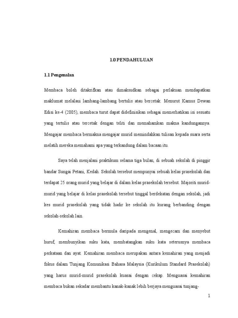 ABSTRAK Kajian ini dijalankan bertujuan melihat sejauh mana bahan bantu. Membaca cerita pendek Ujian Pra Ujian Pasca Bacaan 7. Kajian ini menggunakan pendekatan kualitatif yang melibatkan kaedah pemerhatian temu bual dan analisis dokumenDalam kajian ini tiga orang guru prasekolah yang mengajarkan kemahiran membaca dalam mata pelajaran Bahasa Melayu telah dijadikan sebagai sampel kajian.