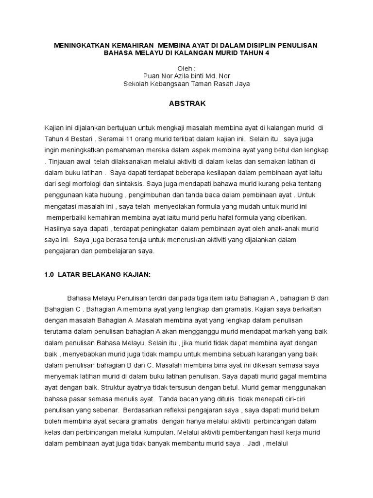 Oleh itu saya merangka pelan tindakan untuk menambah baik amalan pengajaran dan pembelajaran bilik darjah saya agar murid-murid dapat menguasai kemahiran membina ayat topik dan ayat huraian. FLORENCE CHIONG CHUI PING SHAHNAM BIN ABDUL RASHID PISMP BAHASA MELAYU email protected ABSTRAK Kajian ini merupakan kajian tindakan untuk membantu masalah murid membina ayat majmuk berdasarkan gambar dengan. Kit SAKAMB Meningkatkan Kemahiran Membina Ayat Majmuk Berdasarkan Gambar Dalam Kalangan Murid Pemulihan Khas Tahun 3.