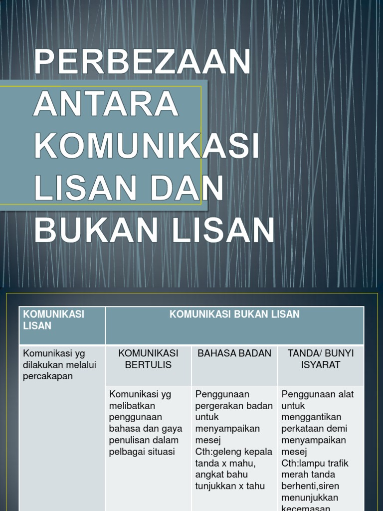 - Secara teorinya komunikasi lisan dan komunikasi bukan lisan ialah dua cabang komunikasi yang berlainan dan mempunyai perbezaan. KOMUNIKASI BERKESAN Komunikasi adalah penting dalam mana-mana perniagaan yang berjaya atau organisasi. Share nota sains sukan penggal 1 2 3 everywhere for free.