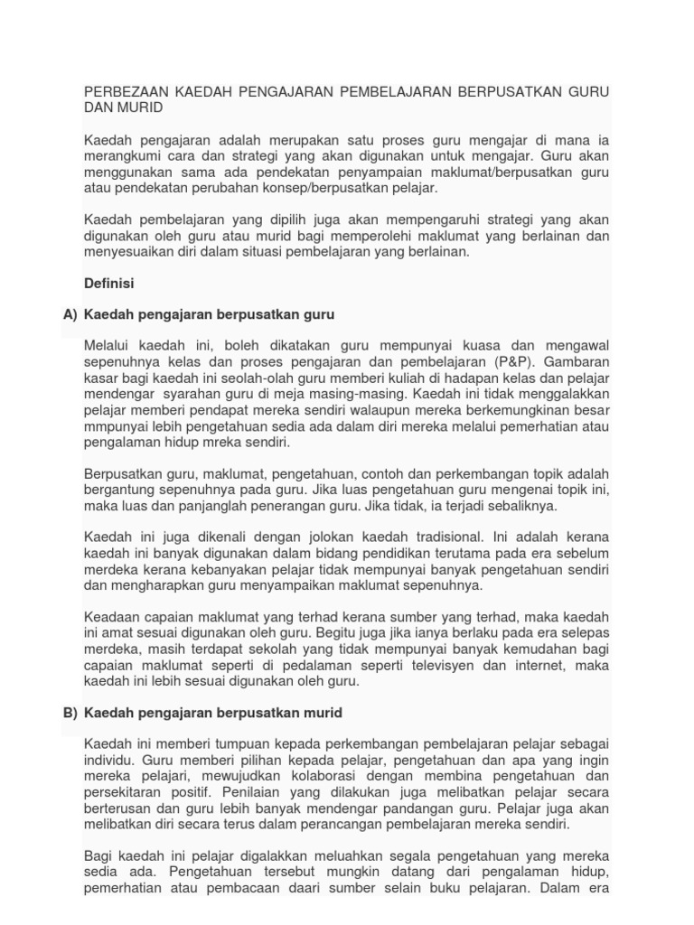Perbezaan Kaedah Pengajaran Pembelajaran Berpusatkan Guru Dan Murid Pdf