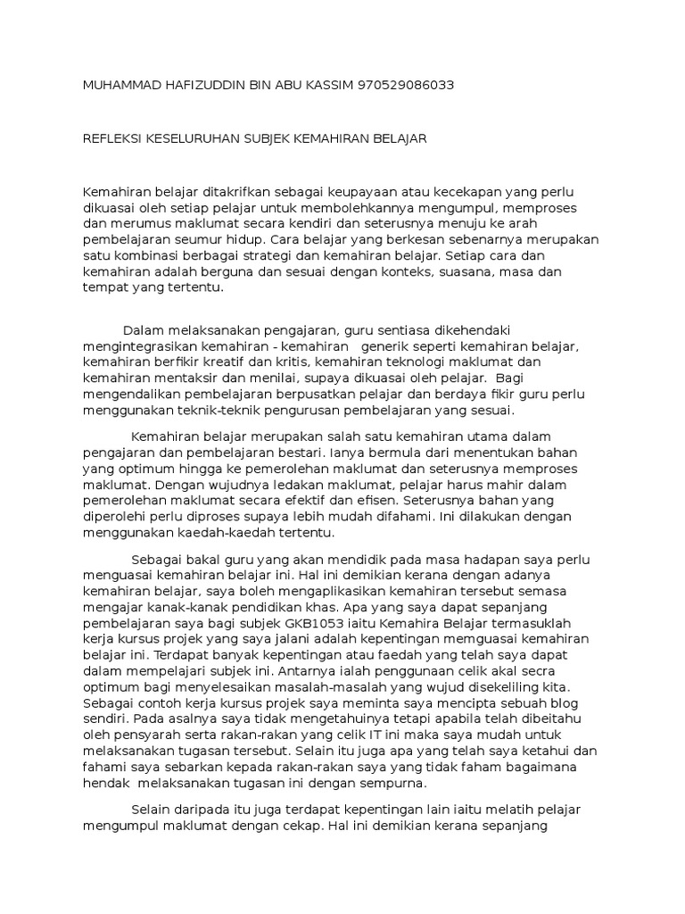 Refleksi Keseluruhan Subjek Kemahiran Belajar Pdf