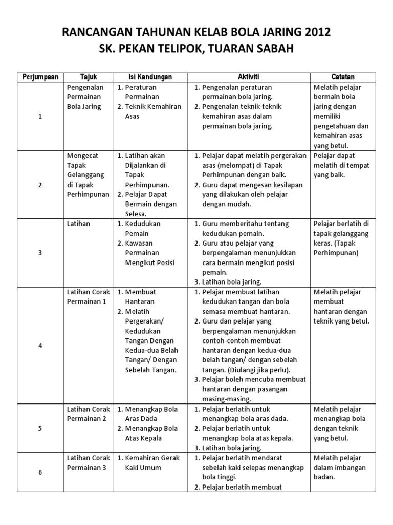 PELAN UNIT SUKAN PERMAINAN BIDANG KOKURIKULUM BIDANG KOKURIKULUM UNIT KELAB SUKAN PERMAINAN ISI KANDUNGAN BIL UNIT MUKA SURAT A Pelan Strategik Unit Sukan Permainan 2019-2021 2 B Pelan Taktikal Unit Sukan Permainan 2019 3 C Pelan Operasi Unit Sukan Permainan 2019 4-6 1 Bola Sepak dan Futsal 7-9 2 Sepak Takraw 10-13 3. Jaring bola tampar adalah 1m lebar dan 950m panjangyang diletakkan di atas paksi garisan tengah. Setiap pasukan perlu terdiri daripada sekurang-kurangnya enam orang pemain dan tidak melebihi 12 orang pemain yang berdaftar.